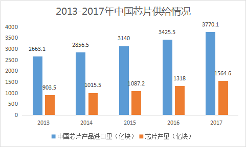 根據(jù)中國(guó)半導(dǎo)體協(xié)會(huì)與國(guó)家統(tǒng)計(jì)局統(tǒng)計(jì),中國(guó)芯片產(chǎn)量增速自2013至2017,在波動(dòng)中達(dá)到平均15%,年產(chǎn)量也從903億塊增長(zhǎng)至1565億塊,但總體來(lái)看,中國(guó)芯片供給市場(chǎng)仍大量依靠國(guó)外進(jìn)口。2015年芯片進(jìn)口額超2000億美元,超越了原油和大宗商品,成為中國(guó)第一大進(jìn)口商品。2017年更是達(dá)到了2601億美元。