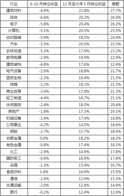 下表中的差額列,反映出的是”sell in may”效應(yīng)的顯著程度,差額越大,效應(yīng)越明顯??梢?,建筑材料、綜合、電子、計(jì)算機(jī)、紡織服裝、汽車這幾個行業(yè)的sell in may效應(yīng)明顯。