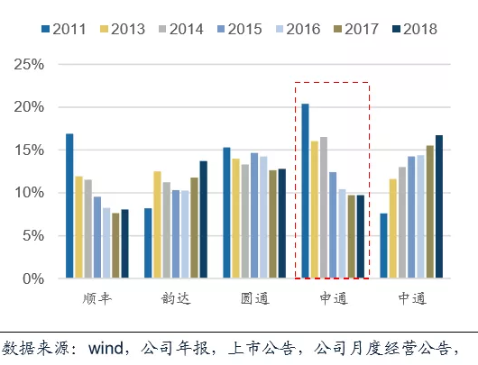 這直接使申通快遞市占率從2011年的全市場(chǎng)第一,超過20%一路下滑到2017年全市場(chǎng)第四不到10%。