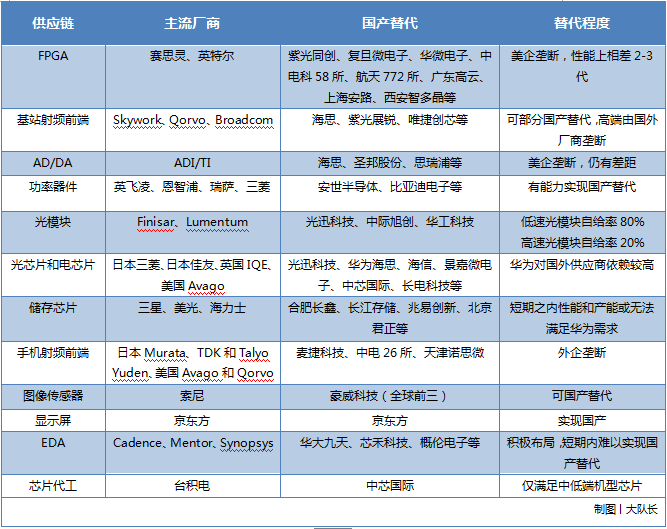 華為的大部分產(chǎn)品線所需進口的零部件均存在國產(chǎn)替代產(chǎn)品,但很多國產(chǎn)器件的性能暫時無法達到華為現(xiàn)有的“一流”供應(yīng)商,少部分產(chǎn)品只能在低端市場或者部分環(huán)節(jié)實現(xiàn)替代。
